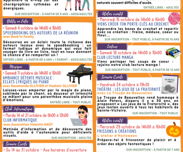 Découvrez la programmation du mois d’octobre à la Médiathèque Antoine Louis Roussin ! Au programme : Danse K-pop, conférence unique, musique, club lecture manga, ateliers créatifs spécial Halloween et bien d’autres surprises. Venez partager des m...